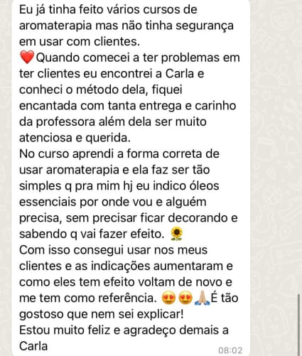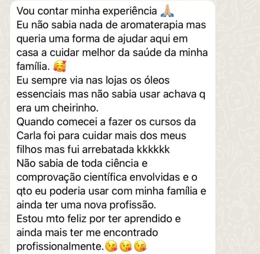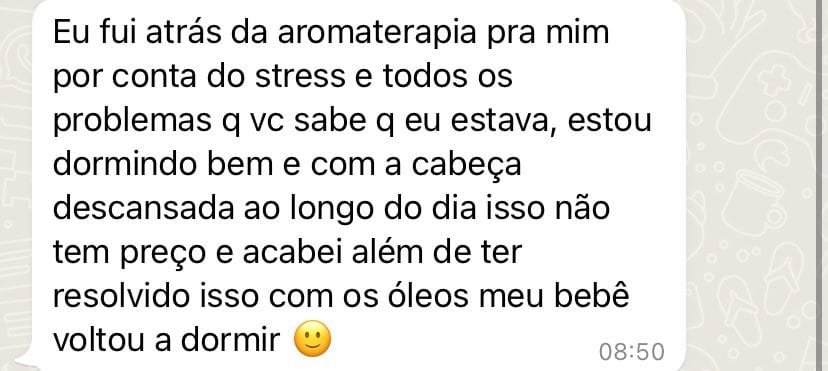Ela nem pensava em trabalhar com aromaterapia, ela conheceu a aromaterapia e os óles essenciais e se encantou! Em menos de 1 mês ela já estava atendendo e ainda com clientes. Então sim, o método funciona com qualquer pessoa que deseje começar a trabalhar ajudando as pessoas através da aromaterapia integrativa.