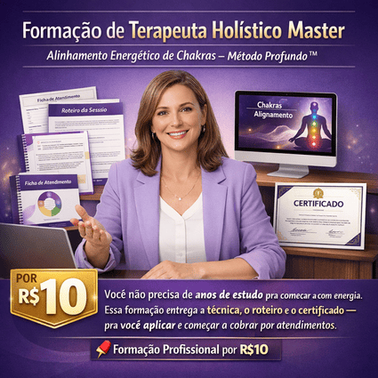 Porque essa formação te entrega uma ferramenta profissional para atuar com atendimentos energéticos — mesmo que você esteja começando do zero — e começar a lucrar ajudando outras pessoas com desbloqueio e realinhamento dos chakras.